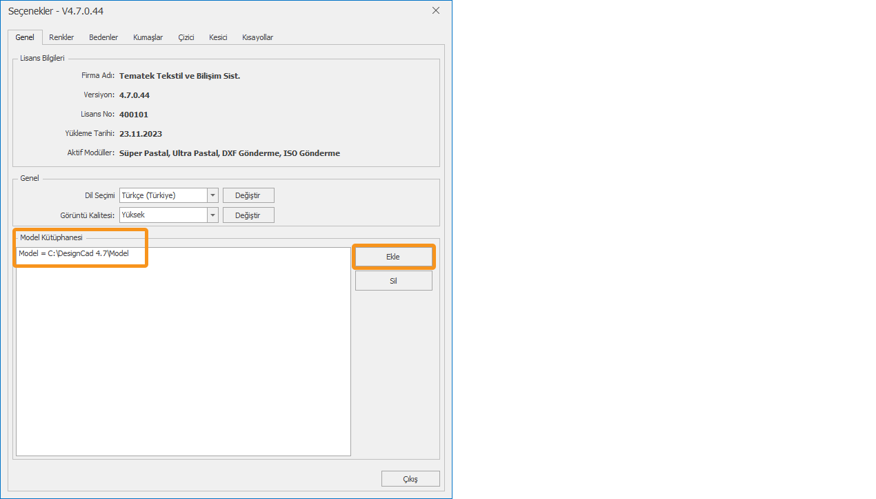 - Genel sekmesinden Model Kütüphanesi yolunu kontrol edin, değişmiş veya silinmiş ise Ekle butonuna tıklayarak kütüphanenizi tekrar tanıtın.