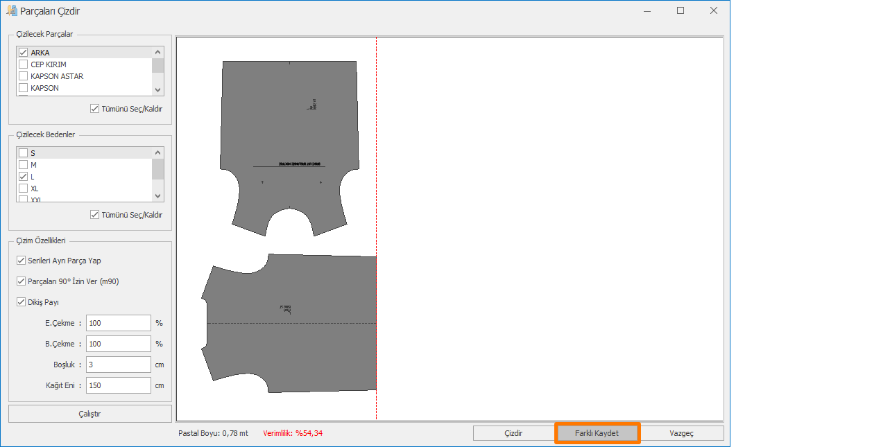 - Parçaları çizdir ekranında çizim dosyası hazırlanır ve Farklı Kaydet butonu ile HPGL dosyası olarak kaydedilir. (Bakınız https://help.designcad.com.tr/tr/parca-cizdir)