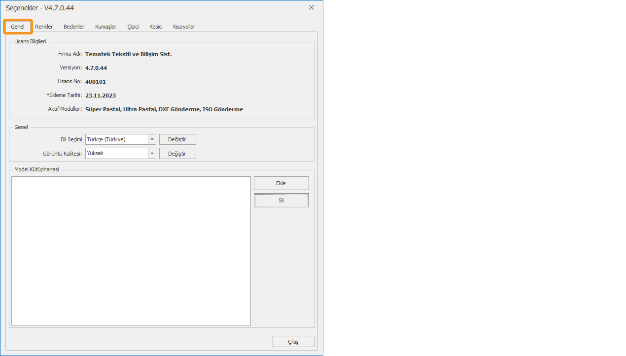 DesignCad yazılımının kurulduğu firmaya ait lisans bilgilerinin bulunduğu, dil, görüntü ve kütüphane ayarlarının yapıldığı sekmedir.