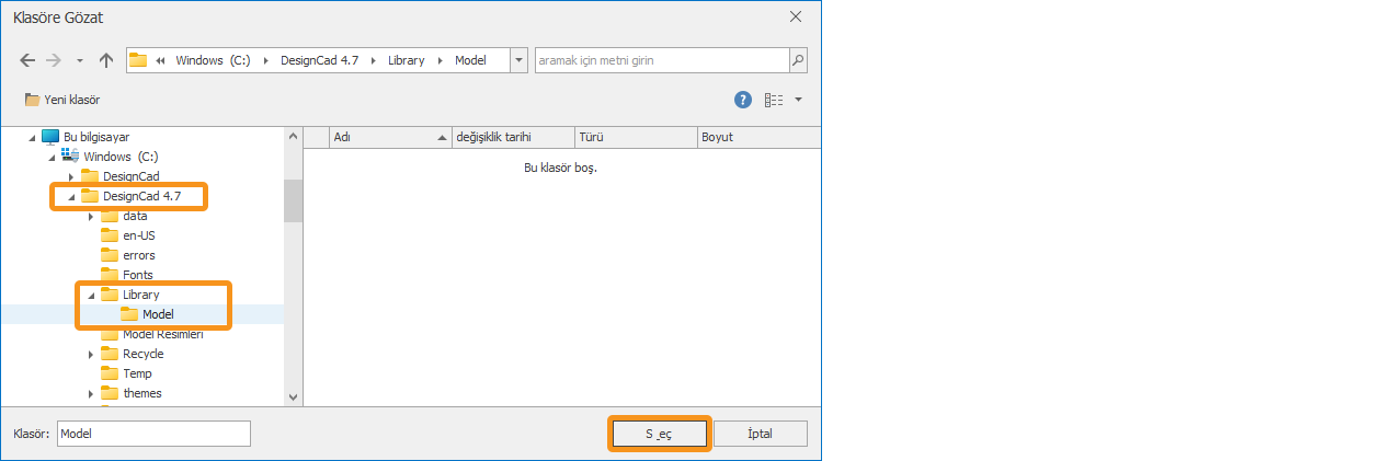 Açılan pencereden DesignCad kütüphane yolu seçilir ve Seç butonu tıklanır. (ilk kurulumda C:\DesignCad 4.7\Library\Model varsayılan kütüphane olarak seçili gelir)