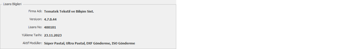 Lisans Bilgileri bölümünde DesignCad yazılımının kurulduğu firma ismi, versiyonu, lisans numarası, yükleme tarihi ve bu lisansa ait aktif modüller yer alır.