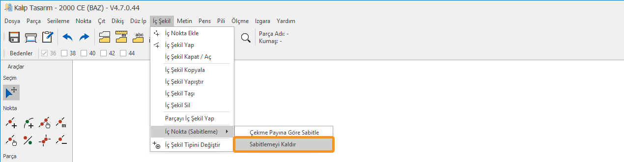 Sabitlenen noktaların sabitlemesini kaldırmak kalıp tasarım ekranında İç Şekil menüsünden İç Nokta (Sabitleme) → Sabitlemeyi Kaldır