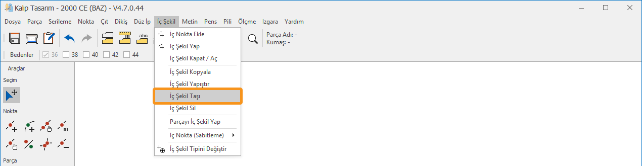 Kalıp Tasarım ekranında İç Şekil menüsünden İç Şekli Taşı