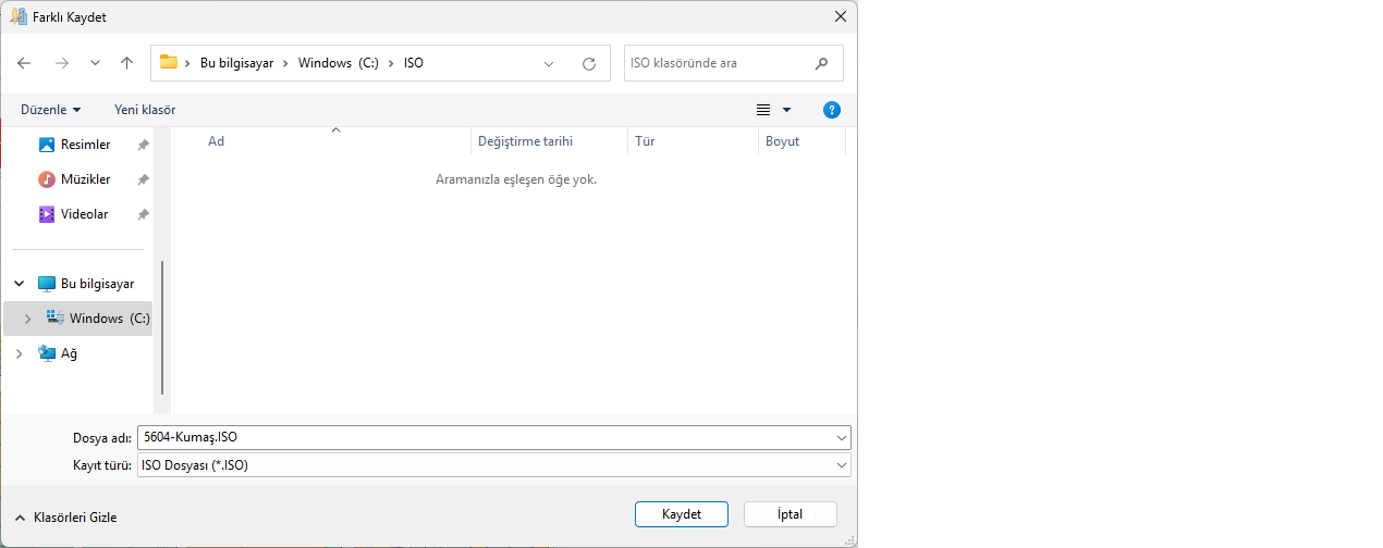Açılan pencereden ISO dosyasının kaydedileceği klasör seçilir ve Kaydet ile kaydedilir.