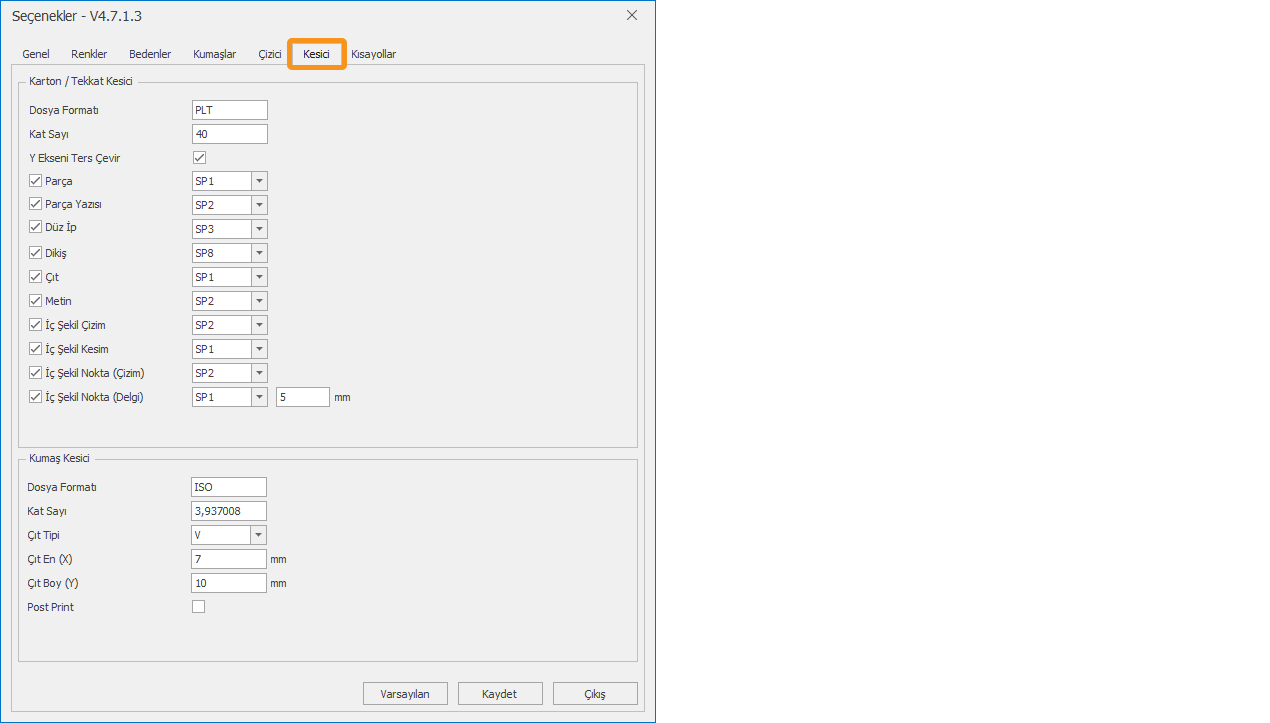 Tek Kat ve Çok Katlı kumaş kesim makinalarına (cutter) gönderilen çizim+kesim dosyalarının nasıl gönderileceğinin, gönderilen dosyada pastala ait hangi bilgilerin olacağının belirlendiği sekmedir.