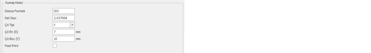 Kumaş Kesici ayarları bölümünden ISO dosyasındaki çıtların tipi ve ebatları seçilir.