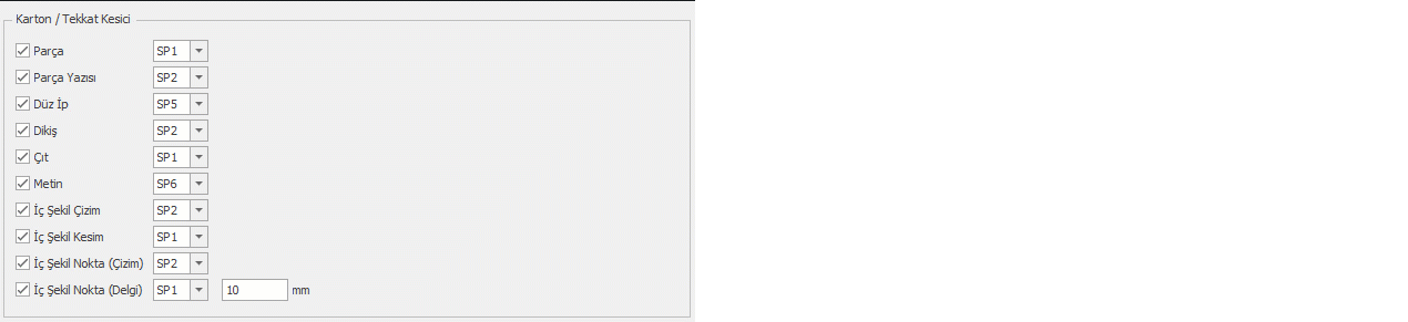 Karton ve Tekkat kesici ayarları bölümünde her özellik için aktif/pasif durumu belirlenebilir ve özellik aktif olacaksa, uygun kalem (SP) seçimi yapılabilir.