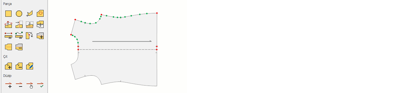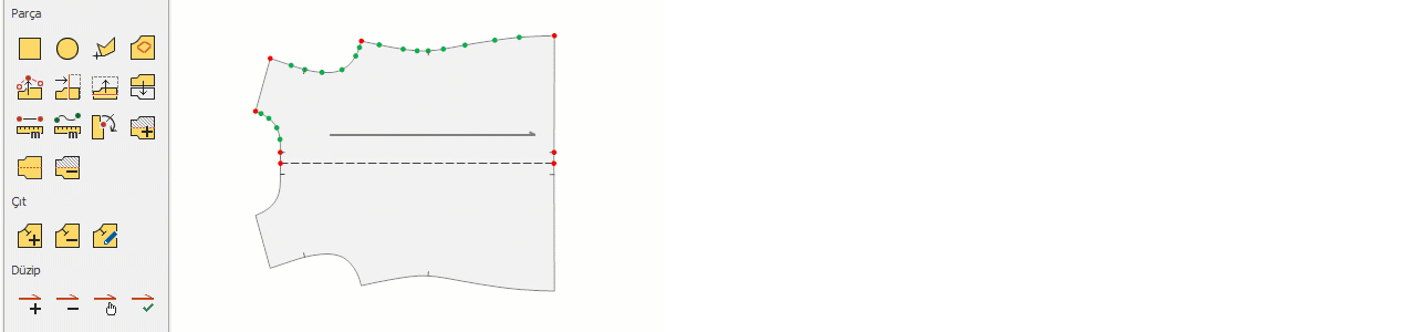 ikonu tıklanır. - Parça üzerinde simetri alınacak hat, saat yönünde seçilir. Önce 1. ardından 2. nokta tıklanır. 2. nokta seçildiğinde, kumaş katı otomatik olarak açılır.