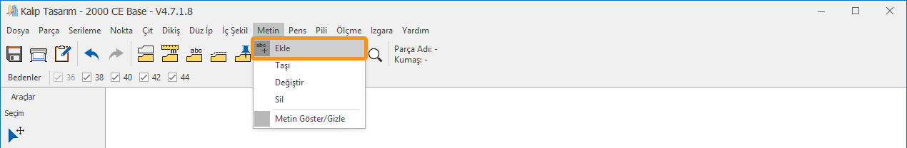 1.) Kalıp Tasarım ekranında, Metin menüsünden Ekle