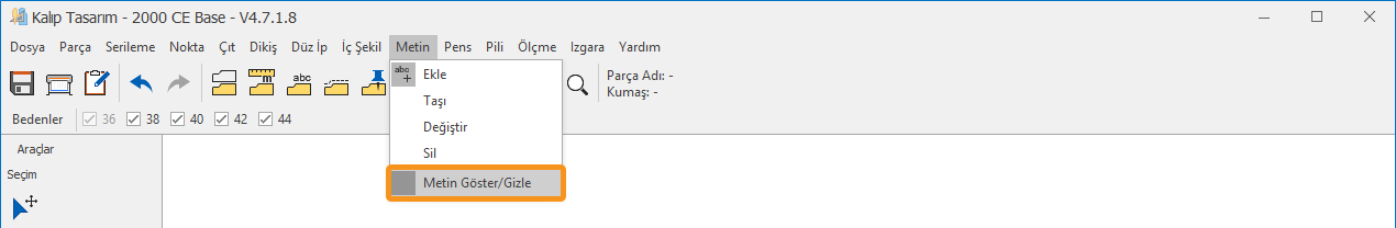 Kalıp Tasarım ekranında, Metin menüsündeki Metin Göster/Gizle