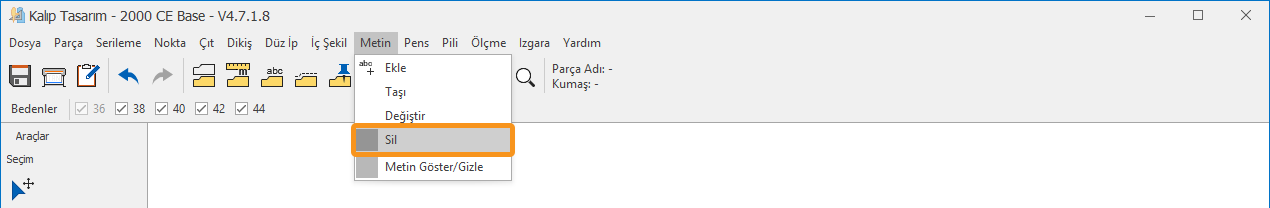 1.) Kalıp Tasarım ekranında, Metin menüsünden Sil