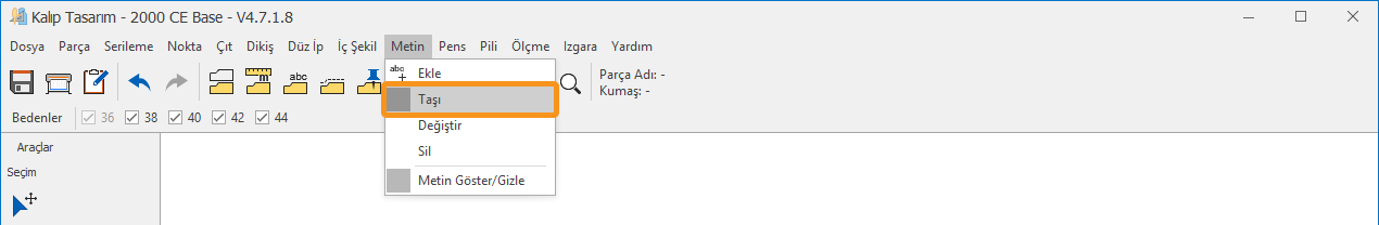 Kalıp Tasarım ekranında, Metin menüsünden Taşı