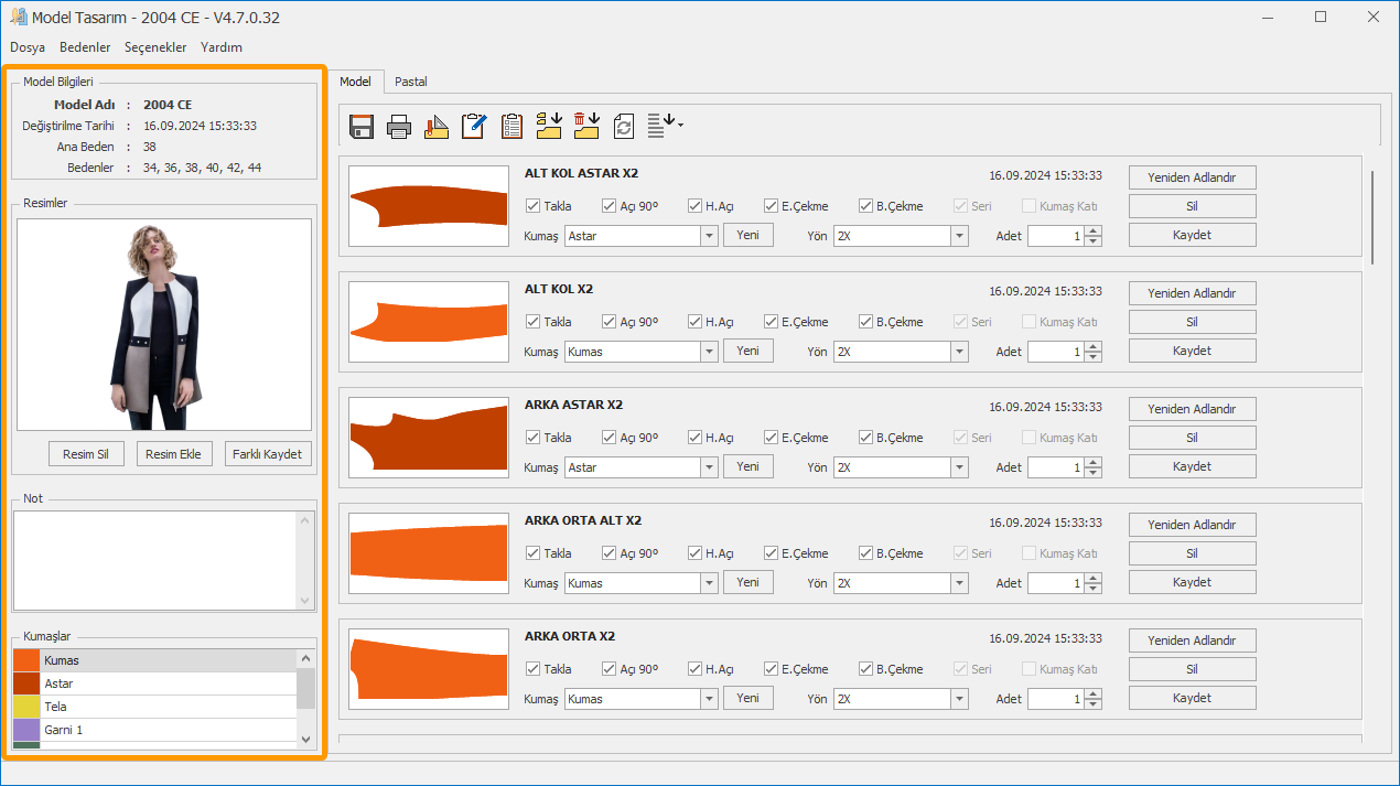 Sağ sütunda Model ve Pastal sekmelerinde modele ait parçalar ve pastallar yer alır.