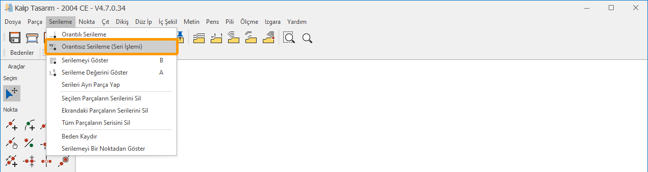 Kalıp Tasarım ekranında, Serileme menüsünden Orantısız Seri
