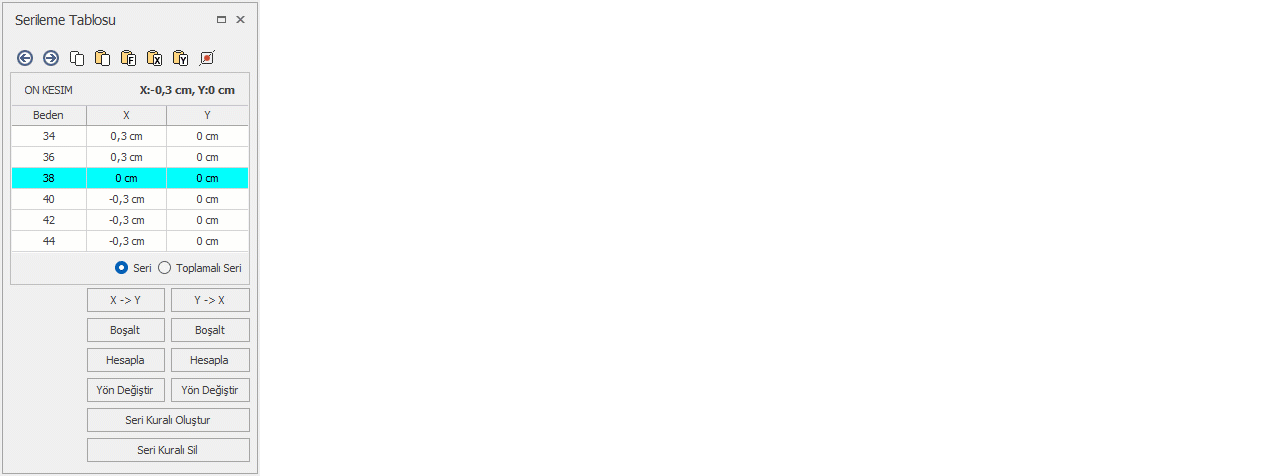 Serileme Tablosunun alt bölümündeki butonlarla X ve Y sütunlarındaki seri değerleri arasında işlemler yapılır.