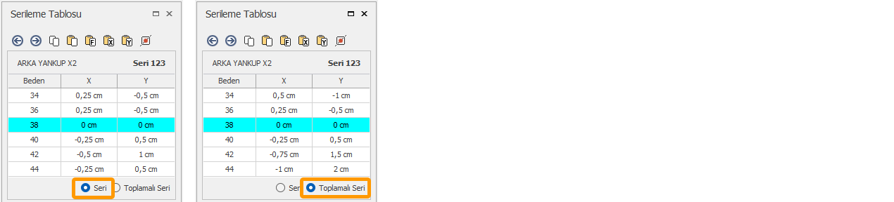 Toplamalı Seri kutusu seçildiğinde, her bedenin baz bedene uzaklık değeri tabloya yansır.