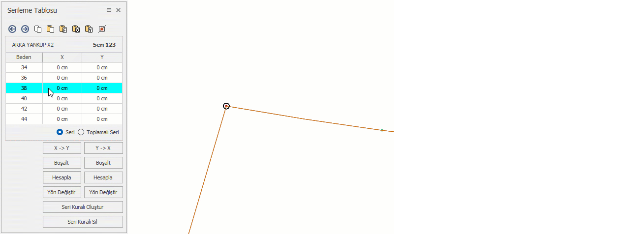 Orantısız seri uygulanacak nokta mouse ile seçilir ve Serileme Tablosu penceresi açılır. Açılan pencerede baz beden (38 beden) pasif görünür ve değer girilemez.