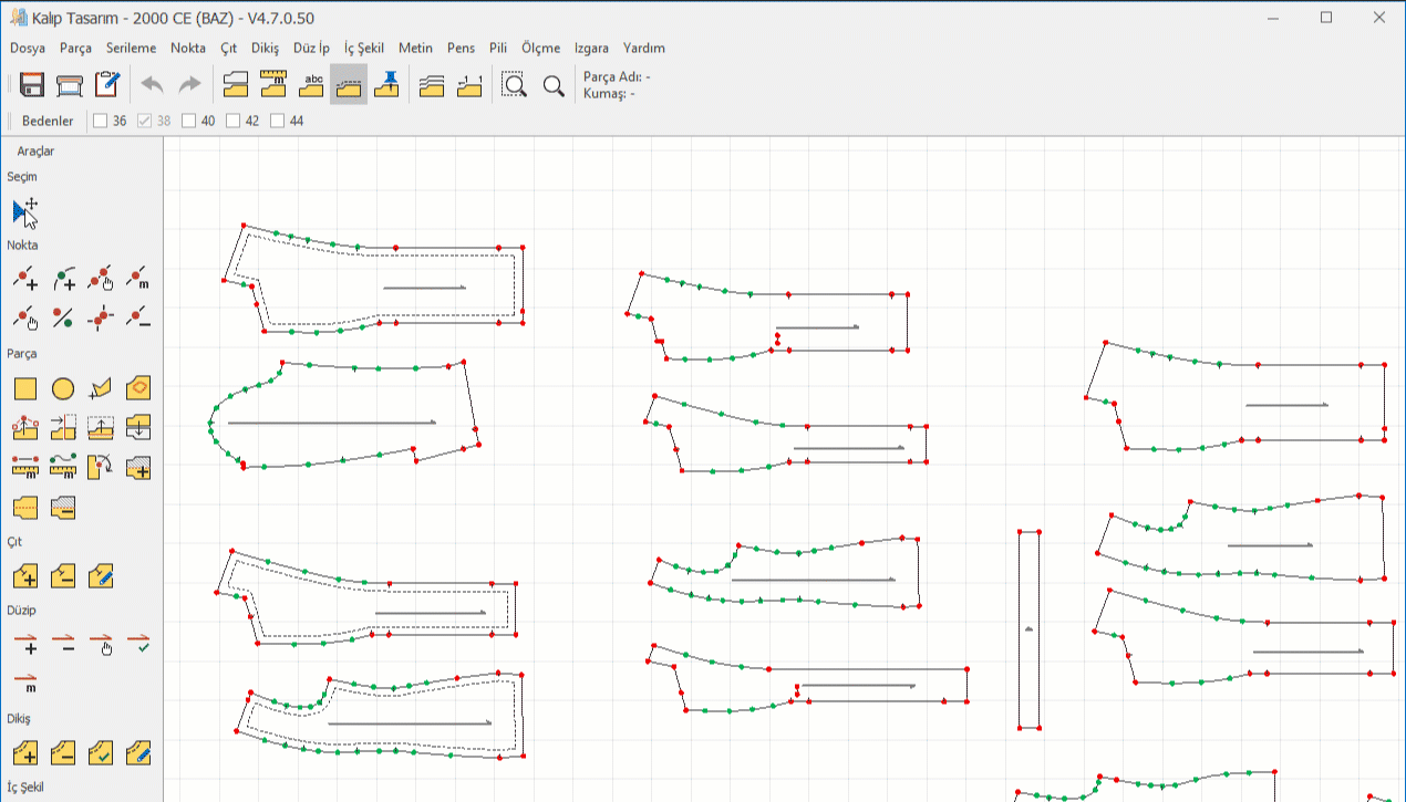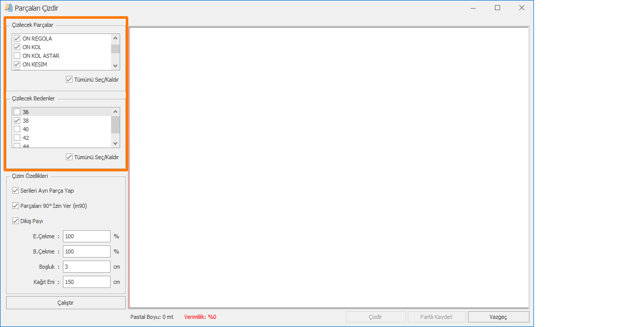 3.) Açılan ekranda seçtiğiniz parçaları sol menüde Çizdirilecek Parçalar bölümünde, bedenler ise Çizdirilecek Bedenler bölümünde seçili olarak gelir. (kalıp tasarım ekranında açık beden yoksa sadece baz beden gelir)