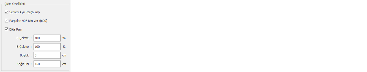 - Dikiş Payı kutucuğu işaretlenirse, parçalar dikişleri açık şekilde çizime gider. İşaret kaldırıldığında ise, parçada dikiş olsa bile yalnızca parçanın ana hattı çizime gönderilir. (Varsayılan olarak seçili gelir.)
