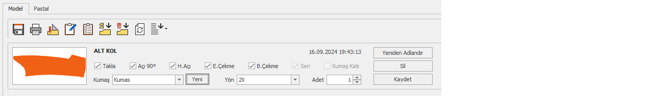 - Kumaş Katı: Kalıp Tasarım ekranında parçaya kumaş katı açılmış ise seçili gelir. (bu bölümde değişiklik yapılamaz)
