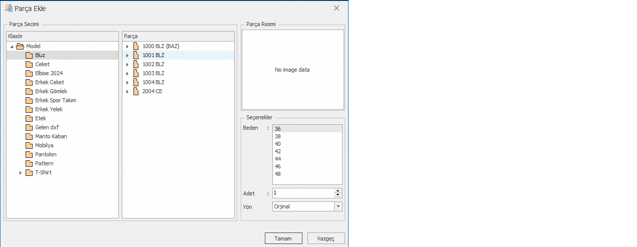 Beden bölümünden alınacak parçanın bedenleri seçilir. (klavyeden Ctrl tuşu ile birden fazla seçilebilir)