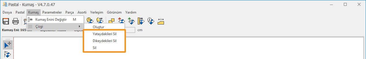 Çizgi menüsünden Yataydakileri Sil veya Dikeydekileri Sil seçenekleri kullanılarak, istenen eksendeki çizgiler silinebilir. Sil seçeneği ise tüm çizgileri kaldırır. Çizgi silindiğinde, parçaların konumları değişmez.