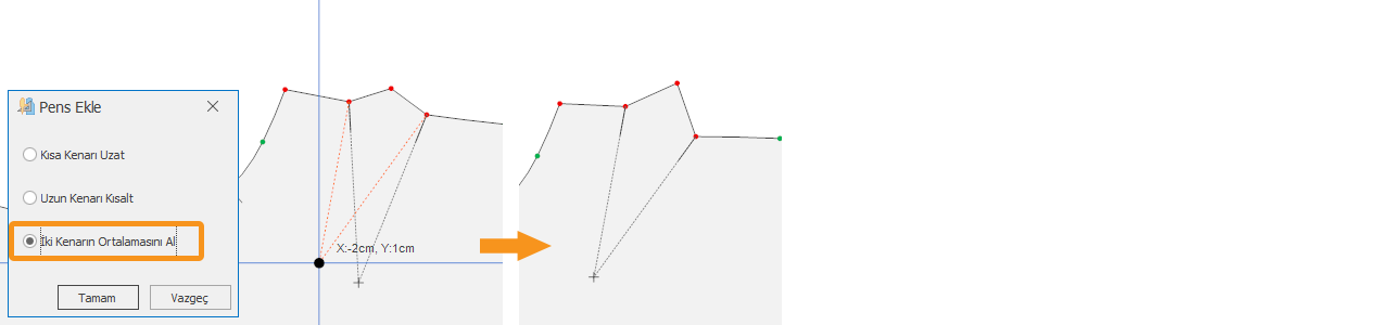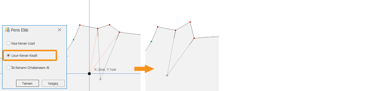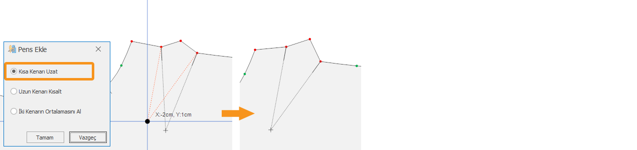 - Kısa Kenarı Uzat: Pens ucunun yeni konumuna göre kısa ayak, uzun ayak ölçüsüne göre uzatılır.