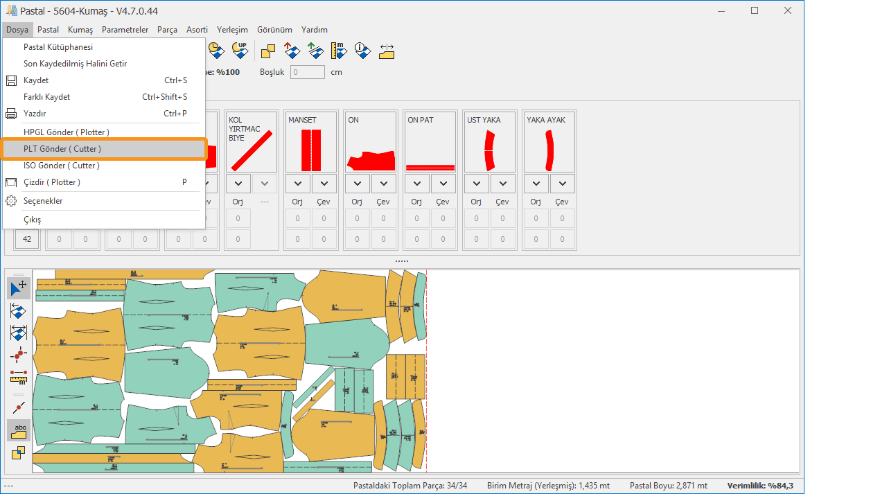 Pastal ekranında pastal hazırlandıktan sonra Dosya menüsünden PLT Gönder (Cutter)