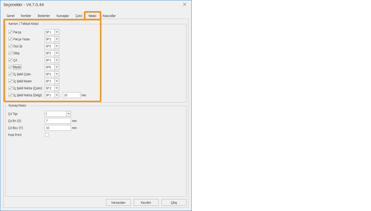 PLT dosyasının kalem ayarları Seçenekler/Kesici sekmesinden yapılır.