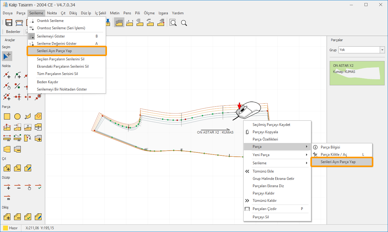 İstenirse parçaya sağ mouse tuşu ile tıklanarak açılan pencereden de Serileri Ayrı Parça Yap seçilebilir.