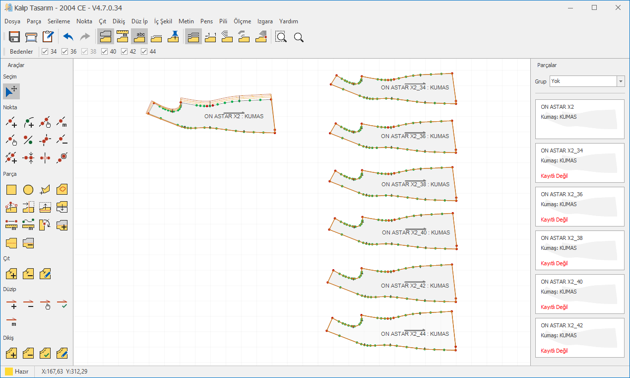 3.) Serilerine ayrılan parçalar, Parça ismi_Beden formatında hem parçalar menüsüne hem de çalışma ekranına eklenir.