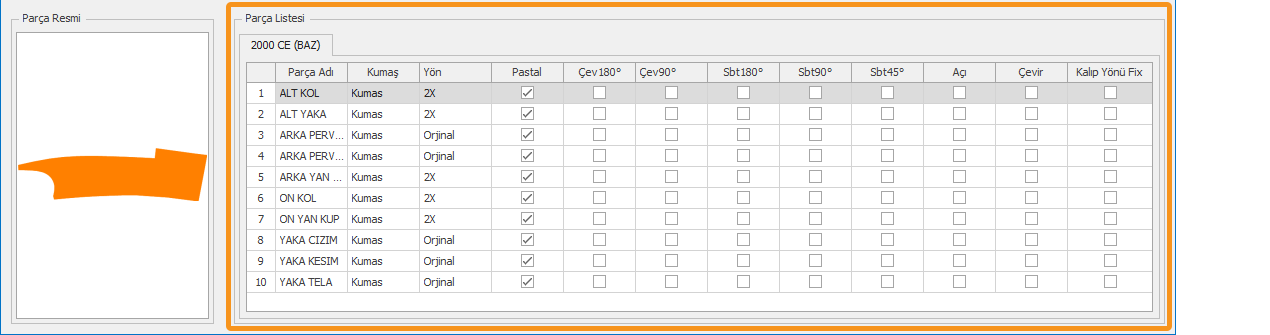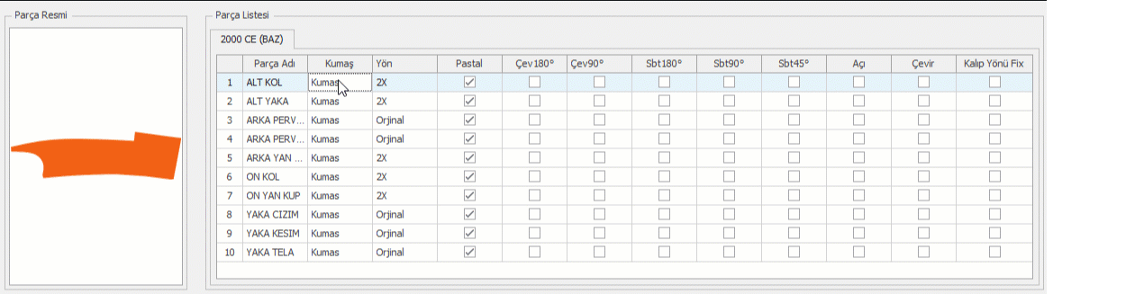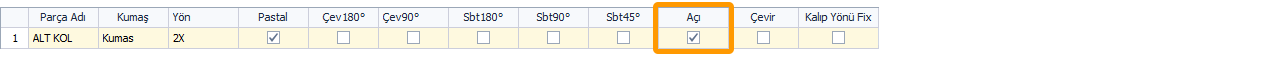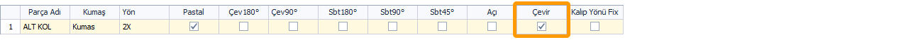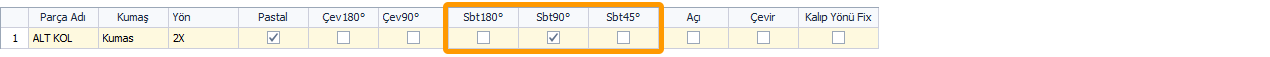 Çev180° ve Çev90° parçanın süper pastal işlemi sırasında düz ipine göre 180° ve 90° derece döndürülme iznidir, süper pastal algoritması en optimum pastal yerleşimi için işaretlenmiş parçayı döndürür veya döndürmez.