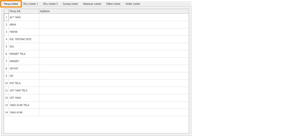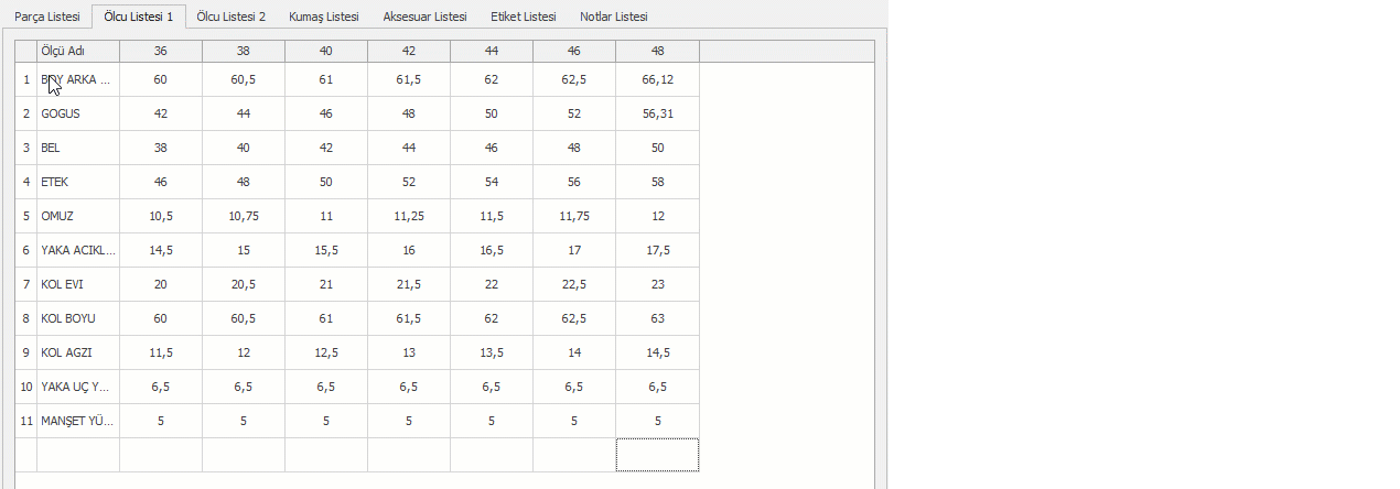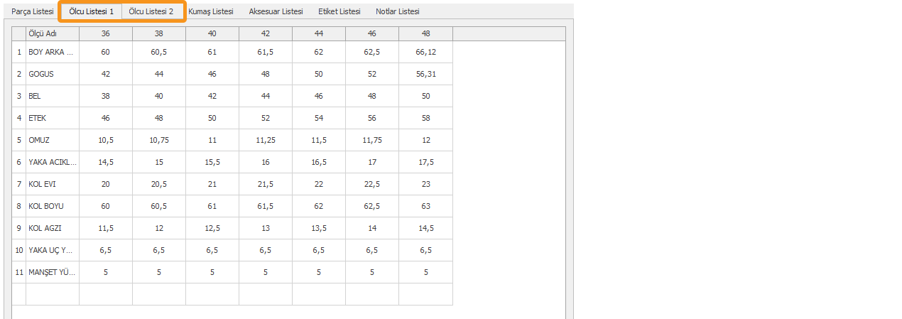 Ölçü Listesi 1 ve Ölçü Listesi 2 sekmesinde parçaya ait beden listesi gelir.