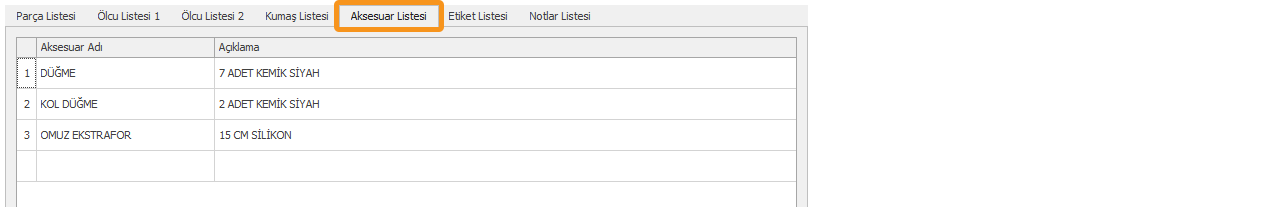 Aksesuar Listesi sekmesi modelde kullanılacak aksesuarların bilgilerinin tutulduğu bölümdür. Bilgiler her satıra manuel girilir veya farklı bir tablodan yapıştır ile de girilebilir.