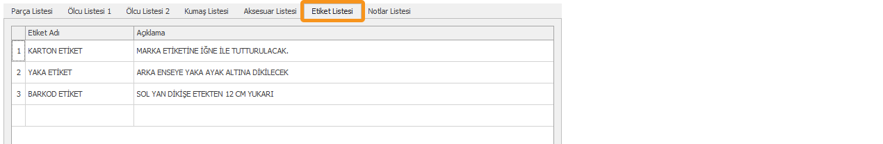 Etiket Listesi sekmesi modelde kullanılacak etiketlerin bilgilerinin tutulduğu bölümdür. Bilgiler her satıra manuel girilir veya farklı bir tablodan yapıştır ile de girilebilir.