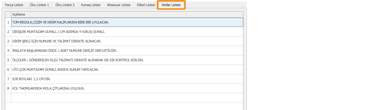 Notlar Listesi sekmesi modele ait imalat notlarının tutulduğu bölümdür. Bilgiler her satıra manuel girilir veya farklı bir tablodan yapıştır ile de girilebilir.