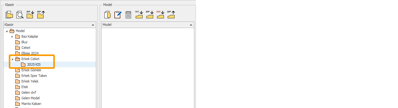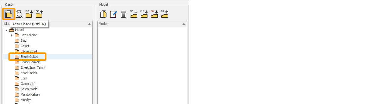 1.) Yeni klasör, hangi klasörün altında oluşturulacaksa, Klasör sütunundan o klasör seçilir. (Örneğin, "Erkek Ceket" klasörü altında yeni bir klasör oluşturmak istiyorsak)