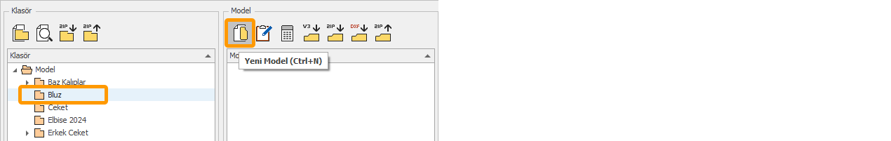 1.) Ana ekranda, Klasör sütunundan modelin oluşturulacağı klasör seçilir (örn: Bluz klösörü) ve model sütunundan Yeni Model ikonu tıklanır.
