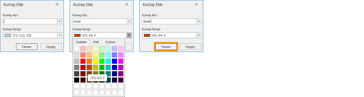 İstenirse, Yeni Kumaş butonuna tıklanarak açılan pencereden yeni bir kumaş ismi girilebilir, rengi seçilir ve Tamam butonuyla onaylanarak modele dahil edilebilir.