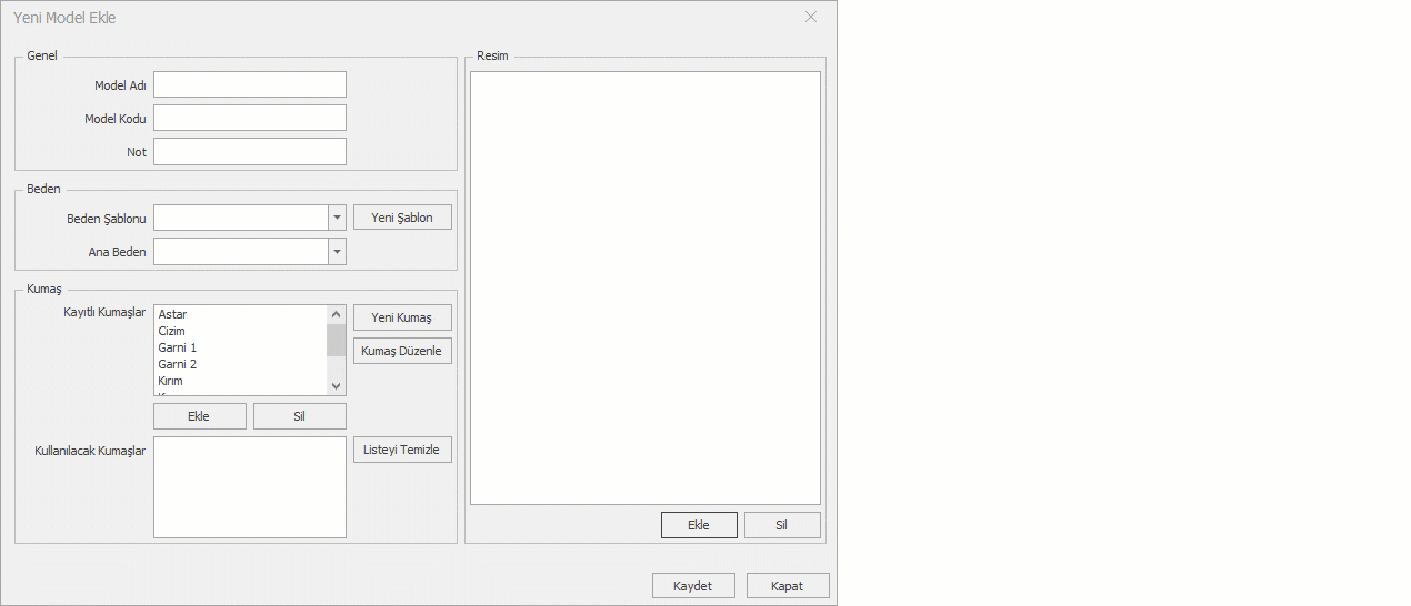 Kayıtlı Kumaşlar: Önceden kaydedilmiş kumaşların kayıtlı olduğu alandır, bu bölümden modelde kullanılacak kumaşlar seçilir, Ekle butonuna basılarak veya kumaş ismine çift tıklanarak modele eklenir.