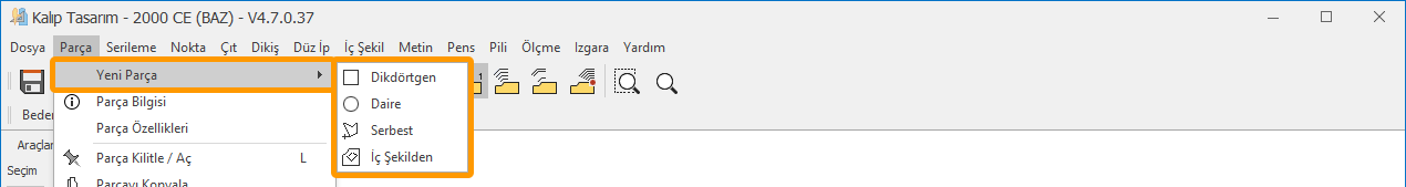 1.) Kalıp Tasarım ekranında Parça menüsü altında Yeni Parça > Serbest