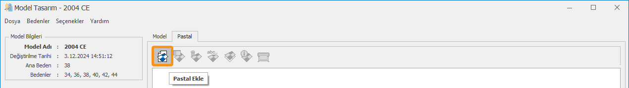Model, Model Tasarım penceresinde açıldıktan sonra, Pastal sekmesinden Pastal Ekle seçeneği tıklanır.