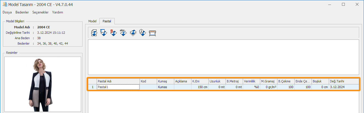 Örneğin Kumaş 34, 40 ve 42 bedenden bir adet, 36 ve 38 bedenden iki adet parça pastala dahil edilmiştir, pastaldaki toplam iş sayası yedi, parça sayısı 217'dir.